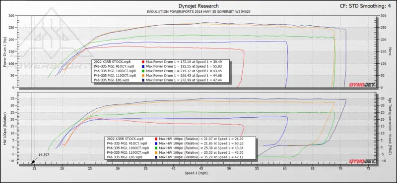 DYNO NOTE: DUE TO THE MG1 TORQUE STRATEGY, THE BOOST FIGURES LISTED REPRESENT MAXIMUM BOOST ON A HOT ENGINE. WHEN INTAKE TEMPS ARE COOLER, BOOST WILL BE LOWER, HOWEVER IT WILL MAKE THE SAME POWER AS WHEN THE BOOST IS HIGHER. THE ECU ALWAYS TRIES TO MAKE THE SAME POWER GIVEN ENVIRONMENTAL CONDITIONS AND IT DOES THIS BY ALLOWING THE BOOST TO INCREASE AS THE INTAKE TEMPERATURE CLIMBS.